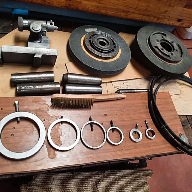 Cylindrical DANOBAT GRINDER "EQUIPPED" in full operation, include: 2 grinding wheels, drive wheels, grinding wheel grinder, set of belts, bench between points with mitutoyo dial gauge to measure parallelism of parts and concentricity, and table-cabinet for workstation. Operation Manual.